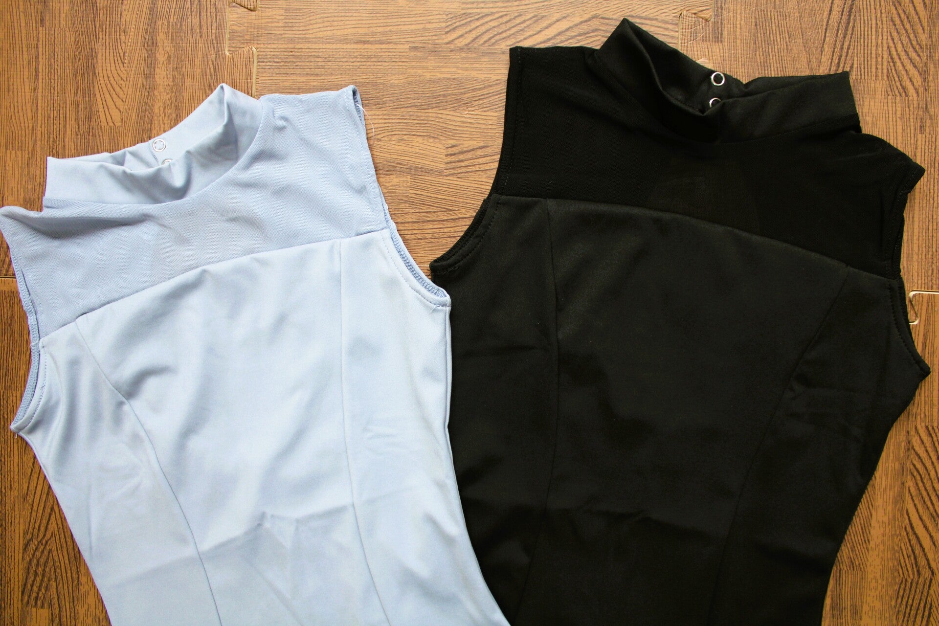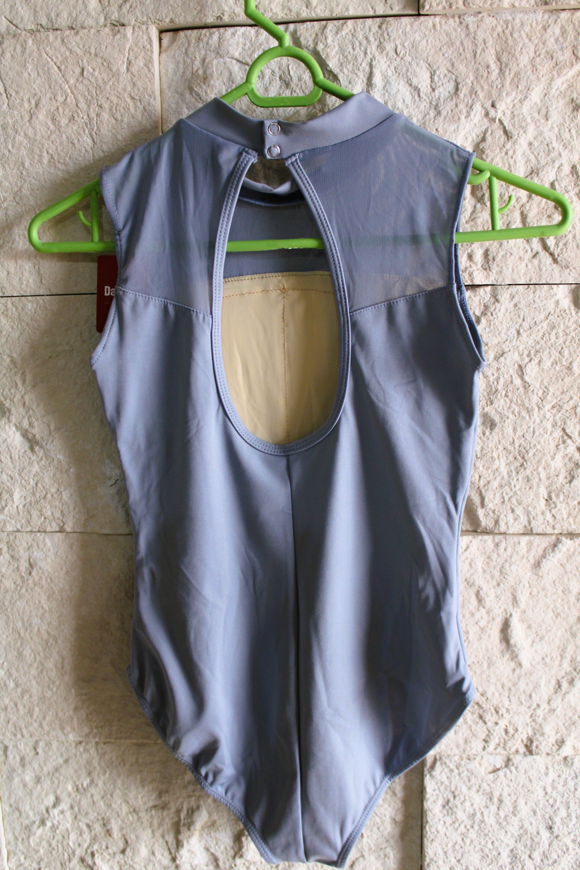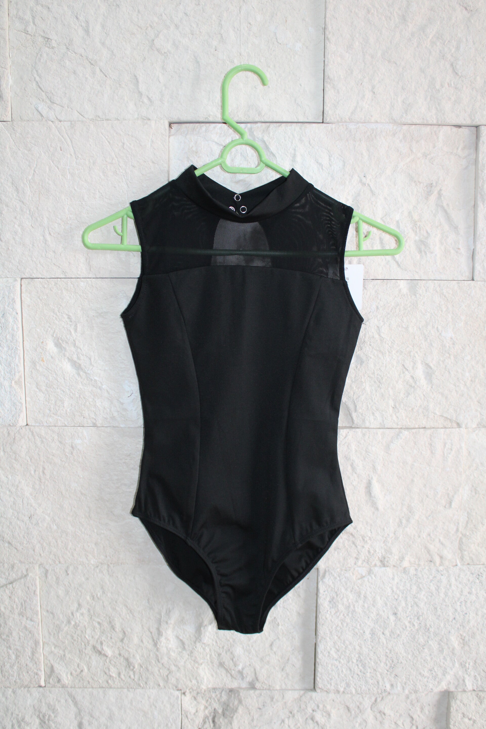 Leotardo sin mangas, con cuello redondo y un pequeño escote en la parte de atrás.